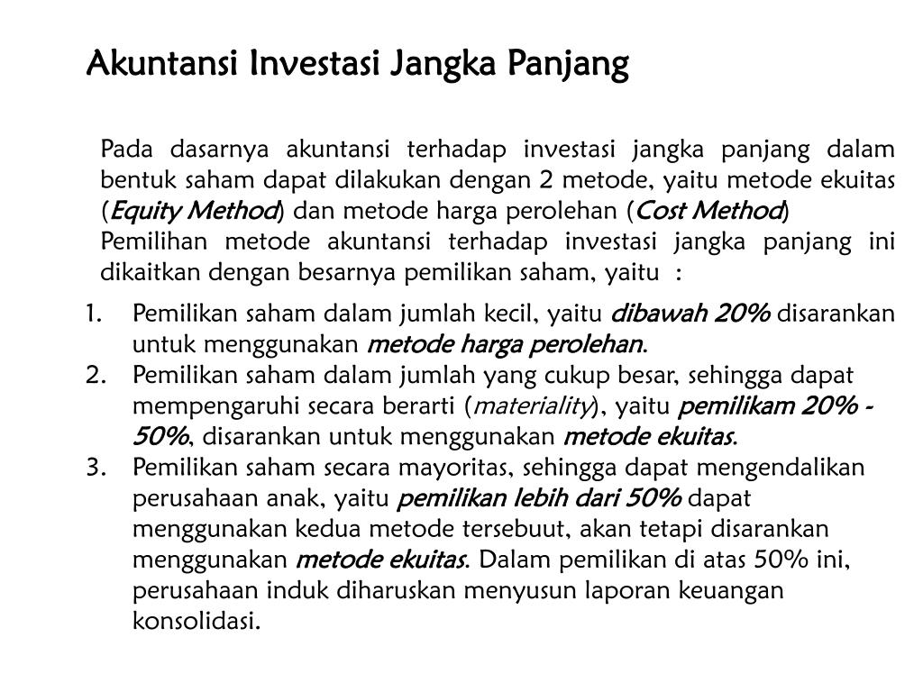 Akuntansi keuangan lanjutan iimetode nilai wajar (biaya) (fair value (cost) method) vs. Method dan saat akuisisi book value dari equity anak perusahaan tidak sama dengan fair valuenya dan fair value tidak sama dengan cost investasinya. Bab 3 laporan keuangan konsolidasi dengan metode equity. Sering kali perusahaan itu lebih mudah memperoleh. Pencatatan dengan metode cost 1. Metode biaya adalah metode pencatatan investasi yang pada awal perolehan investasi, investor mencatat investasi sebesar biayanya (historical cost Pada saat perusahaan anak memperoleh laba, transaksi ini . Pada saat pembelian investasi (sama dengan metode ekuitas). Dalam metode cost, rugi dan laba anak perusahaan diakui pada saat :. Pada saat pembelian investasi (sama dengan metode ekuitas) 2. Konsep yang mendasari metode nilai wajar/biaya dan metode ekuitas. Metode ekuitas (equity method), apabila investor mempunya1 pengaruh signifikan ( 20%) a. Metode ekuitas merupakan sebuah metode akuntansi yang mencatat investasi pada mulanya sebagai biaya perolehan ( .
